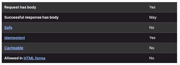 PUT | - 리소스를 대체, 없으면 새롭게 생성 - 주소값 + 데이터 옴 (멱등성O) - 처리할 리소스를 서버에 보냄 - 리소스 처리에 필요한 데이터는 메세지 body를 통해서 전달 - 주로 신규리소스 등록, 리소스 representation 대체에 사용 |