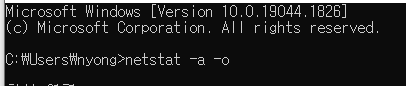 | 1) 관리자모드로 cmd를 열어서, netstat -a -o 명령어 입력 | 2) 현재 사용하는 포트 리스트 중, 로컬주소에서 8080을 찾아 PID를 기억한다. |