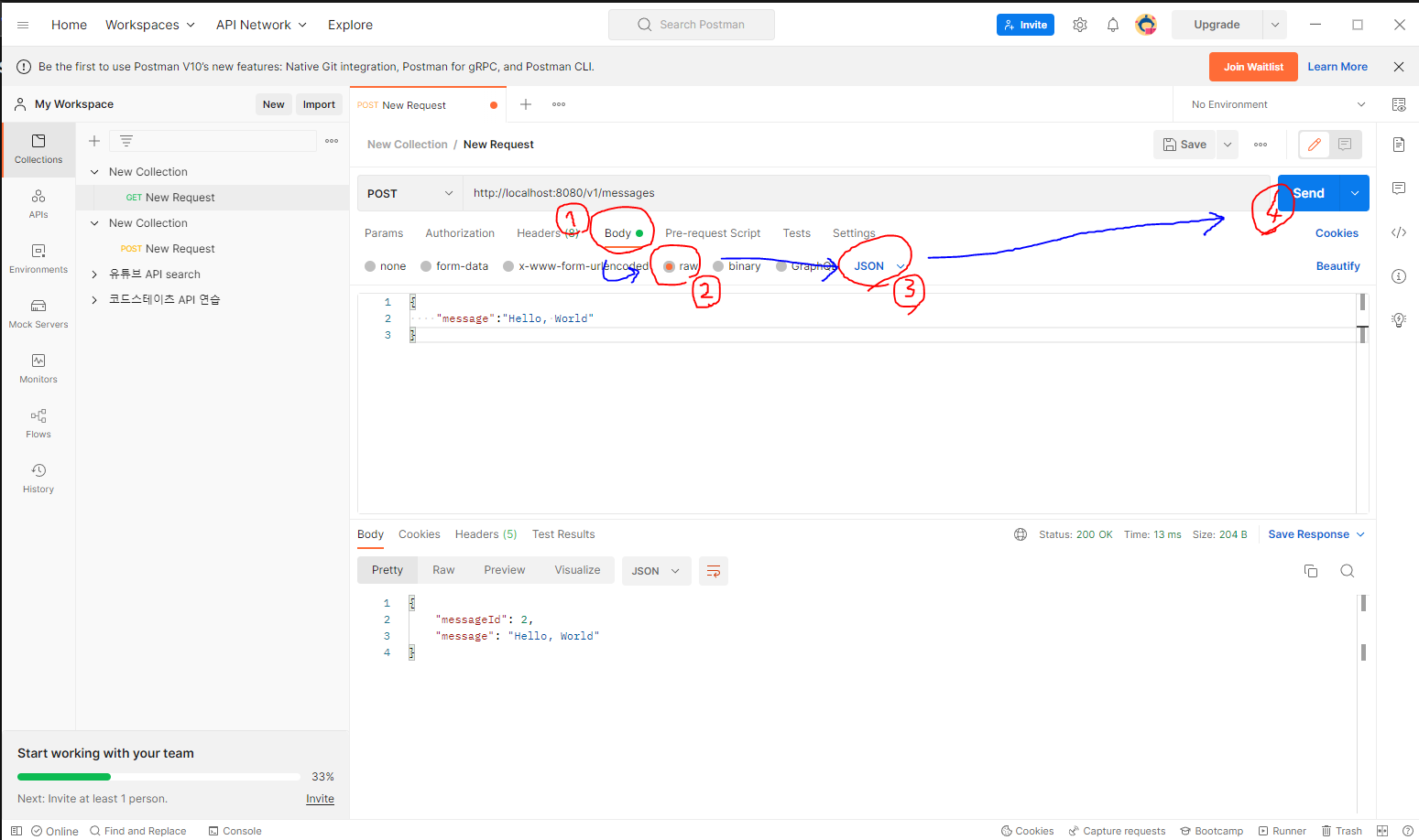 즉, Body => raw => JSON 으로 전환 후 요청
