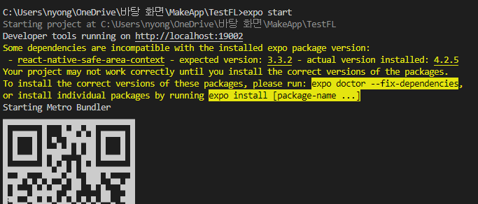 - 아래와 같이 expo start시 문제가 발생하면, 아래의 코드를 터미널에 입력해보자.