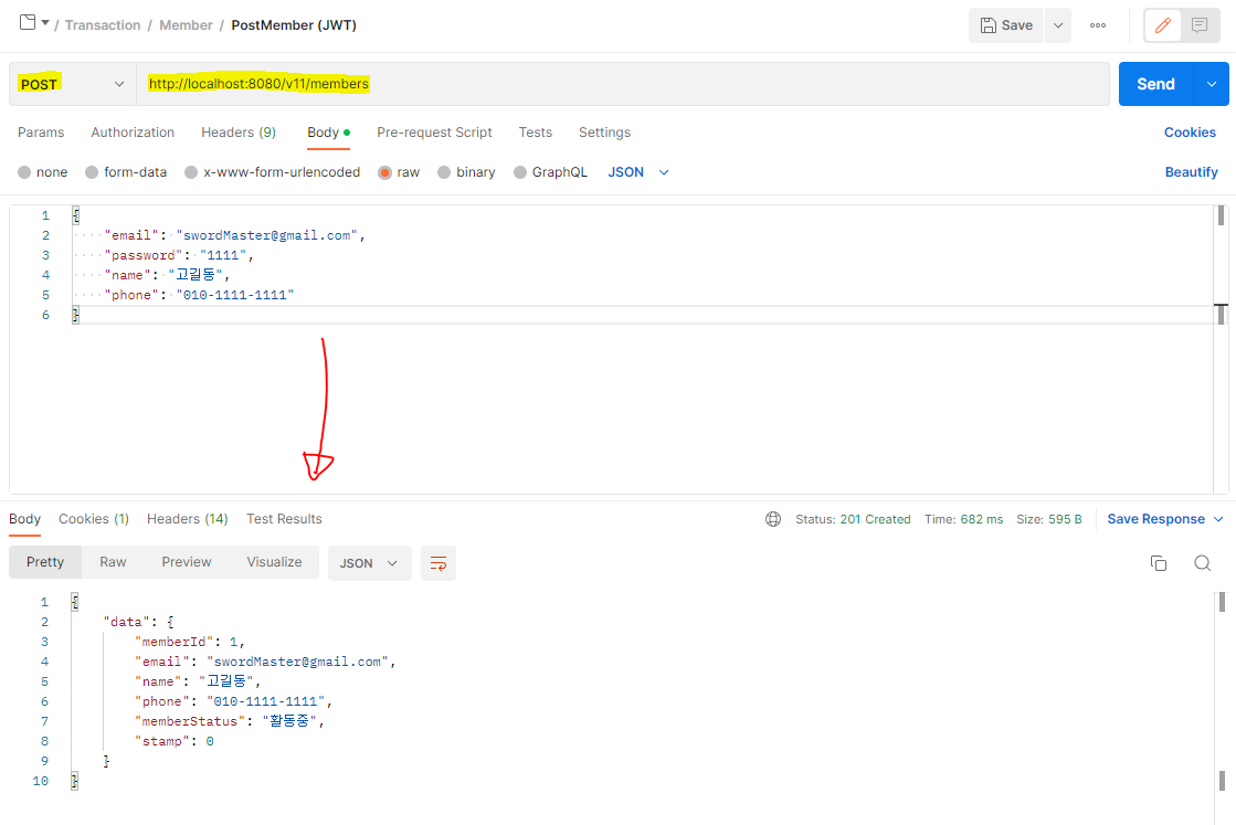 이후, 등록한 회원정보로 로그인을 실행할때, 올바른 response가 오지 않는다.