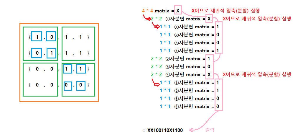 3. 위의 두 조건을 통과하지 못하면 X를 리턴하며, 해당 범위를 1/4로 나눠 각 사분면마다 같은 프로세스를 재귀 진행