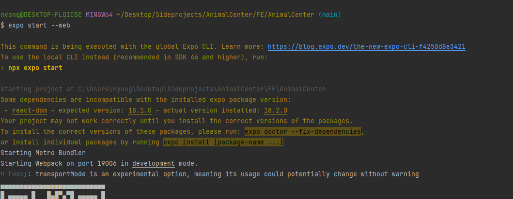 : 만약 상위 디렉토리에서 expo를 재설치 했거나 라이브러리를 설치했다면,