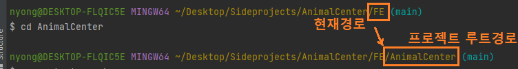 ex) 가령, 현재 위치가 FE에 있는지, 본인 프로젝트에 있는지 터미널에서 확인