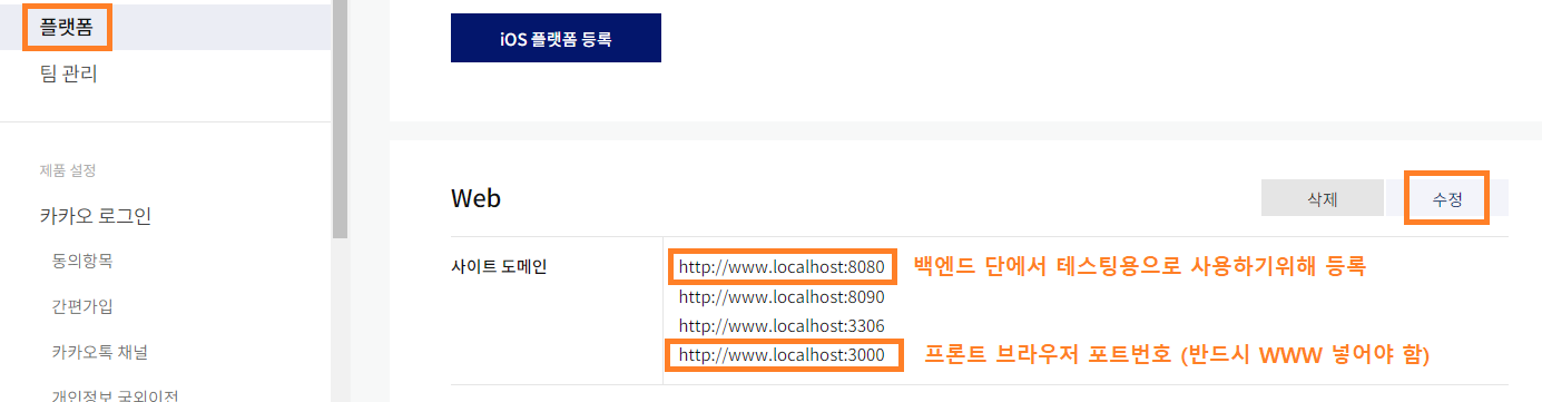 : 내 애플리케이션에서 플랫폼 -> Web에 도메인 URI 등록하기
