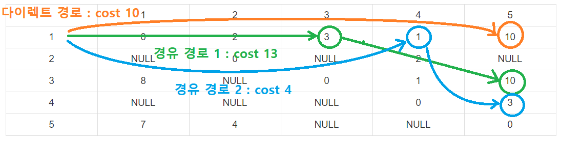즉, 실제로는 파란색과 같은 최소비용 경로가 존재하기 때문에, 중간 경유지를 방문체크해줄 수 있는 2차원 배열(쉽게 생각해서 표)이 필요하다.