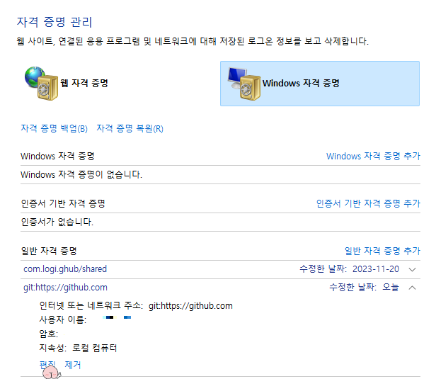 1. [Windows 11 기준] 제어판 > 사용자 계정 > windows 자격 증명 관리 > git:https://github.com 토글 열기 > 제거